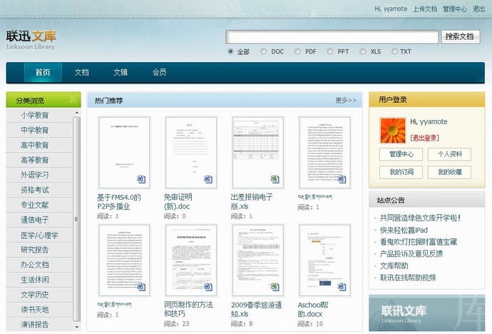 • 近日,联迅软件发布了国内第一款独立文库建站系统——联迅DocSoon文库建站系统。该系统功能丰富,可与国内知名文库网站豆丁网、百度文库网站相媲美。联迅文库系统适用于教育机构、政府机构、日报社、公司企业等行业及单位,方便用户搭建起一套综合性的文档共享交互平台。