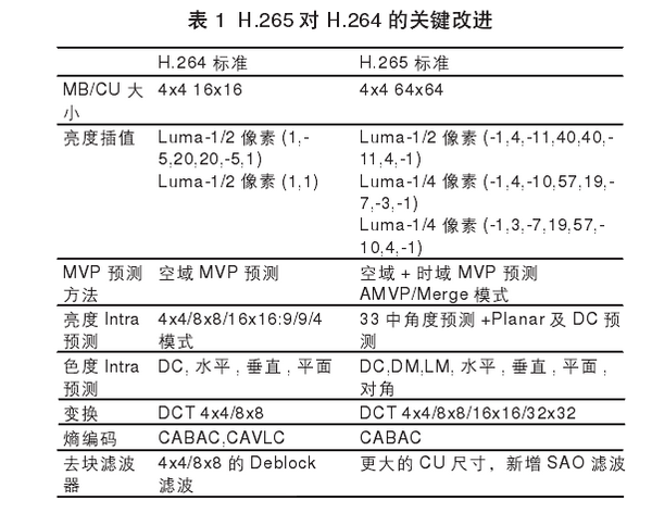 H.265标准沿用了和H.264类似的混合编码框架,但是在此基础上,H.265进行了大量的技术改进,其中比较有代表性的包括:基于大尺寸四叉树编码结构、多角度帧内预测技术、运动估计融合技术、自适应运动矢量预测补偿技术、环路滤波、熵编码技术。