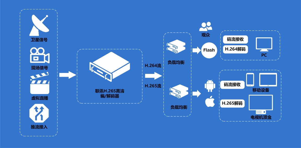 l  采用联H.265高清机顶盒(IPTV)网络电视直播系统/H.265 高清/超清编码器将视频实时编码,将电视信号、摄像等现场信号进行高效率的采集编码,实现在网络上直播。
