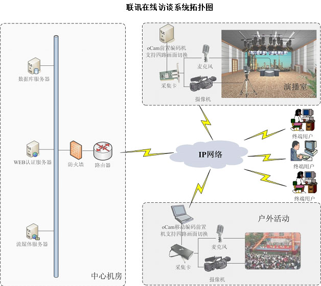 一、方案简介 联讯在线访谈解决方案由oInterview在线访谈网站、oCam直播编码控制台组成。该方案是集网络访谈直播、网络会议直播、网络文字直播、往期访谈点播、观众嘉宾互动等于一体的多用户视频在线访谈建站系统。 该方案具有如下特点: 1、参与用户的角色清晰直观、沟通效果一流 系统将参与交流的用户分为主持人、导播,嘉宾,网友四个不同的角色。访谈开始后,主持人和嘉宾的对话和视频可以采用直播的方式展现给各位网友,网友通过自由聊天区域向嘉宾提交问题,由导播审核后提交主持人转达嘉宾回答。同时网友可利用自由聊天方式对访谈内容与嘉宾、主持人和其他网友做实时交流。 良好的功能设置,使参与在线交流的网友能对嘉宾的发言及时提问、评论,在线的嘉宾对自己的发言能得到及时的反馈并适时解答,大大提高了在线交流的效率,并为在线交流达到良好的效果提供有力的基础。 2、系统前后台分离,各角色有独立的后台查看管理 系统考虑到一次网络在线访谈的角色比较多,如果集中在一个页面中进行管理难免会比较混乱,于是将系统管理员、导播、主持人及网友观众的页面根据其自身在访谈中的任务进行了独立制作,其中导播页面可对网友发言进行审核,也支持速录员对视频访谈的文字直播。而主持人页面则可以查看到审核后的网友发言、提问及在线投票的相关情况。依据角色进行后台划分非常有助于访谈的直播管理。 3、视频、图片、文字灵活搭配,突出个性化 以往聊天室只有文字、图片或者视频的单一化访谈结构,而联讯在线访谈系统则将视频直播、在线文字聊天、现场图片三种方式集为一体,根据访谈的不同情况,可以灵活组合,自由搭配,使在线访谈系统具有高度的适应性。此外,考虑到不同的访谈对界面的不同要求,系统后台模板管理支持html代码,管理员可以为每个访谈上传合适的模板,配合在线访谈方式的灵活组合,使网站的在线访谈既有规矩,又不失个性。 4、严格的用户管理与内容审核,全方位保障在线访谈的顺利进行 在线访谈是一种形式灵活生动但行为正规、严肃的在线交流活动,由于网络的匿名性使在线访谈有可能存在一定程度的随意性,甚至不排除发言不当的情况发生,加上在线访谈活动本身具有的适时性,一旦不当言论被公布出来,有可能对在线访谈活动造成不良影响并带来不可控的损失。联讯在线访谈系统对此情况早有准备,系统内部进行精心设计,可全方位保障线访谈的顺利进行。 在系统后台,访谈开始前管理员即可对访谈的全过程进行总体设置,可以选择是否允许未注册用户发表言论,对网友发表的言论进行审核后发布还是用户发言直接发布,同时支持对某些用户进行IP屏蔽以及敏感字过滤。在访谈当中,导播的角色设置,可以随时临控用户发言,并进行相应的屏蔽与删除功能。 5、访谈内容的总结归纳 以往在线访谈的经验证明,在线访谈的价值不仅仅体现短短的一两个小时当中,更重要的是对访谈内容的归纳总结,实现“再利用”。 系统对此也充分予以考虑,在一次访谈结束后,管理员可以选择是否将这次访谈的视频予以保存和整理,可以根据需要制作成专题或者留作参考资料,方便未参与在线访变的用户集中查看,并有利于日后进行访谈回顾。 6、用户交互方式灵活多样 系统非常注重访谈期间网友与现场嘉宾的在线互动方式。访谈开始前,导播可针对该访谈设置相应的投票选项供网友们选择,主持人可在现场即时看到网友的投票情况,并根据投票情况与嘉宾互动。访谈开始后,网友可以通过文字形式随时提交问题及感想,与投票一样,主持人可以即时看到网友们提出的问题并转达给嘉宾进行解答。 7、美观方便的操作界面 访谈系统的UI界面简洁大方,字体和按钮的大小与位置拥有较好的用户体验;同时,界面更加着重对产品人性化设计,颜色的深浅、字体的粗细,这些基本的元素就能表达出信息的重要程度,使用户一目了然。另外,在访谈直播页面中首次使用了视频窗口拖拽及网页栏目位置自适应的功能,用户可依据喜好及访谈视频清晰度来随意调整视频窗口大小进行观看。 综上所述,联讯在线访谈系统不仅具有一般在线访谈系统的功能,其精心的设计更可全方位保障整个在线访谈的顺利运行。同时,因其优秀的功能特性,联讯视频在线访谈系统不仅可用于网络嘉宾访谈,其还可广泛应用于网络视频聊天室、网络招聘、网络远程采访、网上讲座或报告、网络招商等多种形式。 8、最多支持4路摄像机切换 系统不仅可以支持单路视频信号进行在线访谈直播,还可进行两路高清视频切换或者四路摄像机画面切换直播,画面切换速度快,切换过程流畅,最大限度满足在线访谈的直播需求。 9、实现高清在线访谈直播 系统采用Adobe的Adobe Flash播放器10.1技术结合,将视频转化为 H.264编码,达到高清标准。H.264是一种高性能的视频编解码技术,是一种像蓝光和HD-DVD那样的高清视频标准。特别是在在线访谈视频直播中,联讯在线访谈系统可以设定500码率以上的高清直播码率,码率越高越清晰,全屏播放时显示效果越好。 10、多种搭配模式提高负载人数 系统充分考虑目前国内主流的100M网络带宽形式,在程序功能上设置了可自定义视频码率、同时内置了五种视频分辨率可供选择。当一场访谈预计观看人数比较多时,可选择降低