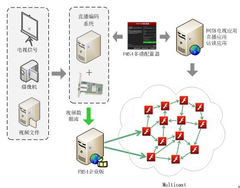 Adobe Flash Media Server 4(以下简称FMS4)发布后, 联讯软件立即投入大量人力进行研究与开发。在其发布短短几周内便掌握了Flashplayer P2P API的使用以及服务器的配置方法。